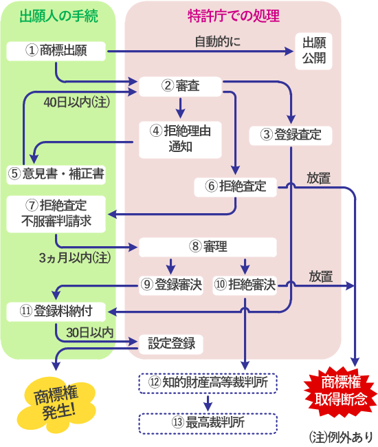 審査結果がOKの場合 → ③登録査定 → ⑪登録料納付後、商標権発生